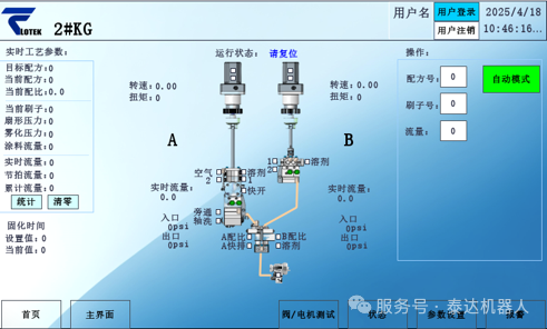 控制软件界面简洁、操作简单,可实现流量与压力实时监控、换色与填充操作、喷涂工艺切换、本地与远程模式切换、系统参数设定、配方参数设定、流量校准及故障监控。